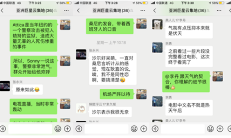 担心多数员工英文水平可能看字幕依然未必能完全跟上剧情,于立新老师同时在微信群随时将比较难以理解的段落、有关情节的社会背景、语言上比较有特色的地方跟同学们交流,从同学们的反映看,达到了较好的教学效果。