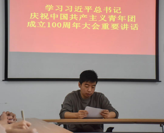会议中,丁炳文老师着重讲到了习近平总书记对共青团的希望。第一,坚持为党育人。志存高远方能登高望远,胸怀天下才可大展宏图。新时代的青年应该用敏锐的眼光观察社会,用清醒的头脑思考人生,用智慧的力量创造未来。第二,自觉担当责任。奋斗是青春最亮丽的底色,行动是青年最有效的磨砺。有责任有担当,青春才会闪光。第三,心系广大青年。共青团是党领导的群团组织,也是青年人自己的组织。既要把青年的温度如实告诉党,也把党的温暖充分传递给青年。第四,勇于自我革命。“常制不可以待变化,一途不可以应无方,刻船不可以索遗剑。”共青团只有勇于自我革命,才能跟