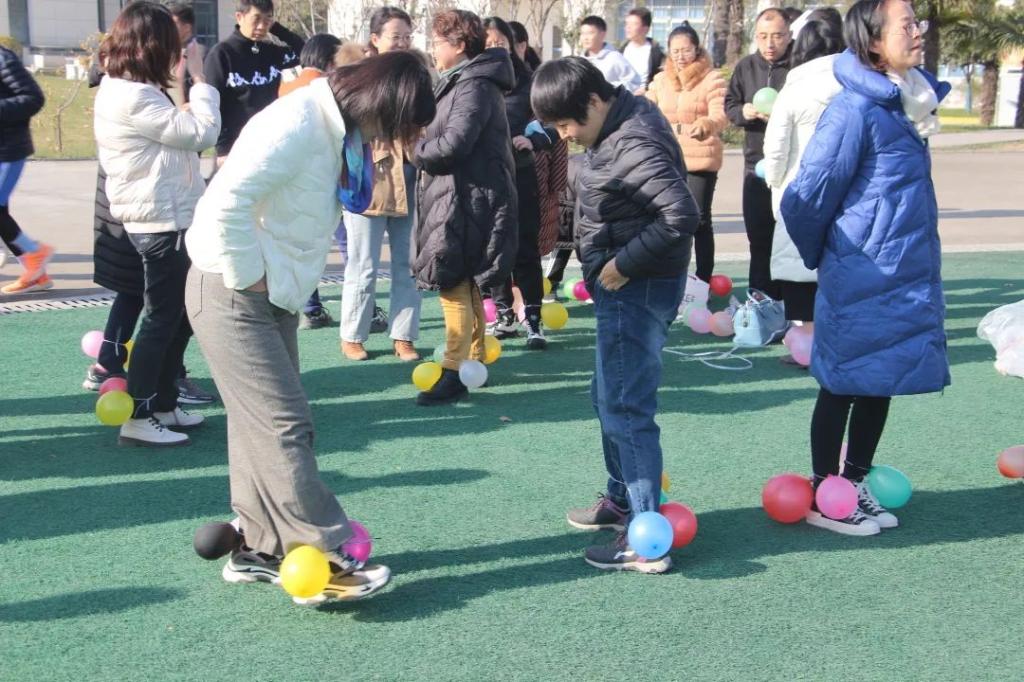 第一个项目是踩气球。参加活动的教职工每个人的脚踝上都绑有两个气球,八个人一组,踩破别人的气球,同时保持自己的气球不被踩爆。