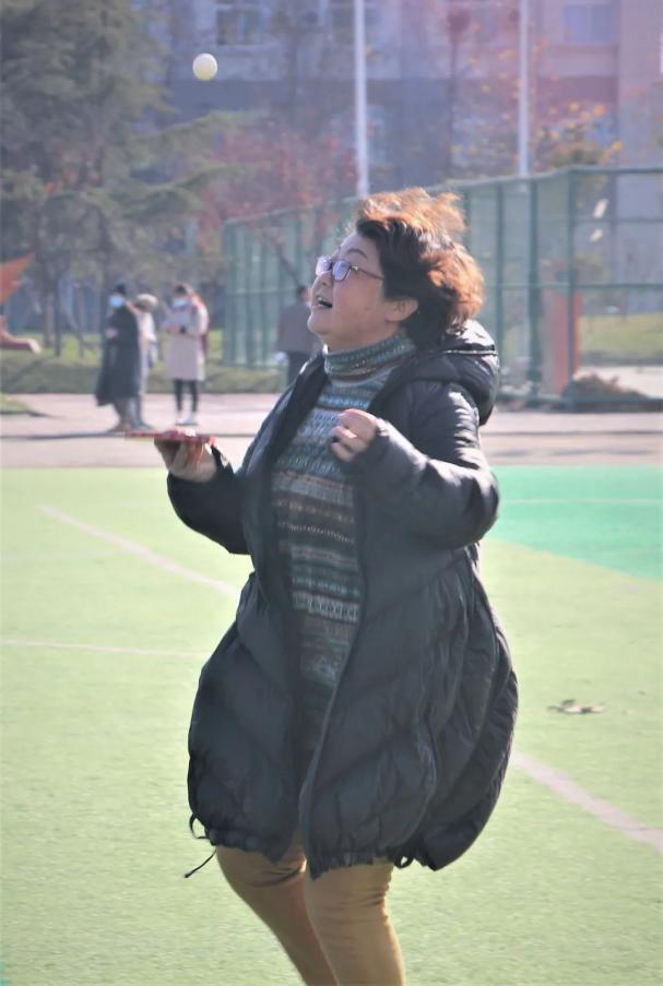 第二个项目是分组往返颠乒乓球。参加的教职工们分成了三组,将乒乓球颠到指定位置后返回到起点。