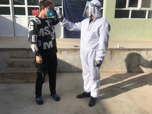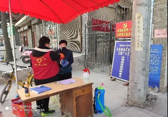 2020年2月11日,全村老员工为做好疫情防控工作进行值班,配合村医测量体温。