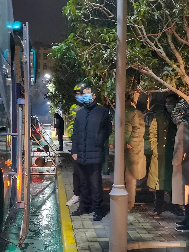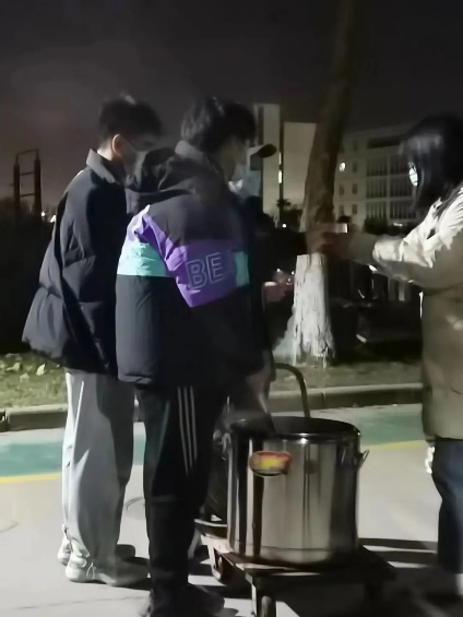 在寒冷的冬夜里,老师陪伴在同学们两侧,时刻关注着核酸队列,并提醒同学们前方有姜汤领取处。