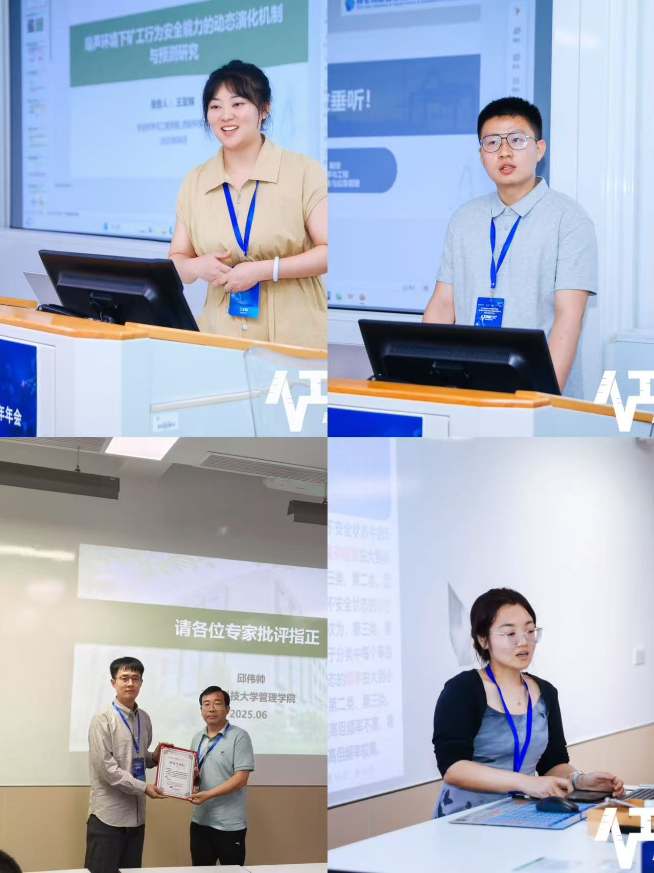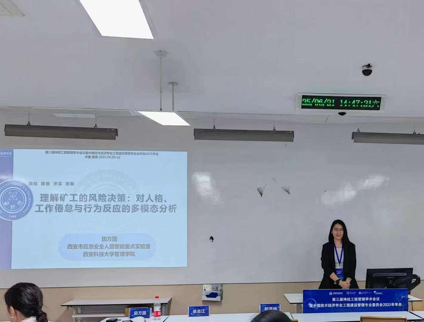 来自工程管理学界及相关研究领域的资深学者和青年学术精英围绕主题分享了各自的最新研究成果。公司安全管理团队师生积极向此次学术论坛投递论文,并做了学术报告,宣传了西安市应急安全人因智能重点实验室在相关领域的研究成果。李琰教授在主题分论坛2作了题为《基于心电信号的矿工疲劳状态识别研究》的报告,田方圆老师在主题分论坛1作了题为《理解矿工的风险决策:对人格、工作倦怠与行为反应的多模态分析》的报告,均受到众多领域专家的认可与支持。王亚娟博士在博士生分论坛1作了题为《噪声环境下矿工行为安全能力的动态演化机制与预测研究》的报告,宁世强博士在博士生分论坛1作了题为《突发公共事件下社会资本、社区认同和感知安全韧性之间的关系:来自上海的证据》的报告,邱伟帅博士在博士生分论坛2作了题为《时间压力下工作倦怠对矿工不确定决策影响的认知神经机理研究》的报告,王钧钰硕士在硕士生分论坛3作了题为《一线矿工不安全状态的分类研究》的报告,与众多年轻学者进行了交流。通过此次会议的学习、交流与讨论,进一步提升了公司安全管理团队研究成果在神经工程管理领域的知名度与美誉度,公司安全管理团队将持续聚焦“神经安全管理”相关议题,围绕人工智能在煤矿作业人员不安全行为与工程管理中的综合应用,开展跨学科融合研究,提升个体与组织的安全管理水平,助力安全科学、管理学与认知神经科学交叉融合的高质量发展。