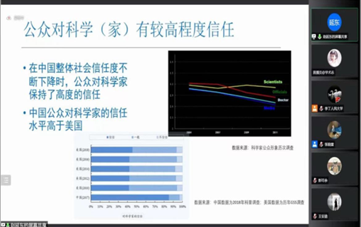 最后,赵延东教授讲解了中国开放科学发展的社会基础。互联网与基础设施的普及、公众对科学发展积极的支持态度、公众对科学家的高度信任、公众对科学知识有强烈的兴趣和需求等因素为中国开放科学的发展奠定了坚实的社会基础。