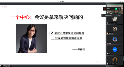 624日晚,国际教育集团商公司执行经理、国际注册会计师、国际教育管理专家许辉老师莅临公司秦汉大讲堂,为师生们带来了一场主题为《高效会议管理》的讲座,帮助师生们在后疫情时代增强组织及参与会议的效率,提高时间利用效能。会议由研究生及学科办公室主任辛扶瑶老师主持,公司研究生积极通过线上与线下相结合的方式参会学习。