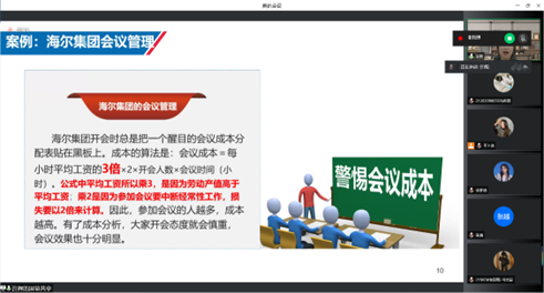 在第二部分,许辉老师通过讲解海尔集团的会议管理案例,引出了本次讲座的重要概念:会议成本。会议成本由时间、金钱、效益和机会成本组成,是提高组织效能的至关重要的因素,会议管理的首要目标就是要降低会议成本,将开会的成本与效益进行匹配,提高成本意识和观念。