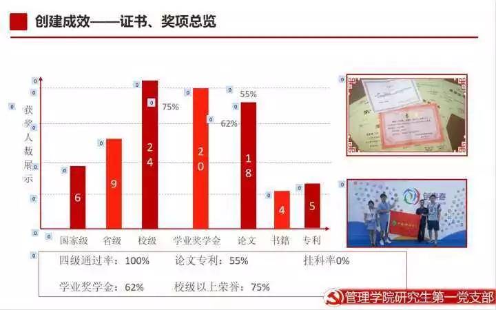 研究生第一党支部成员成绩优秀,学业奖学金占比超过62%、校级及以上竞赛及荣誉占比约为75%、论文专利等占比超过55%。