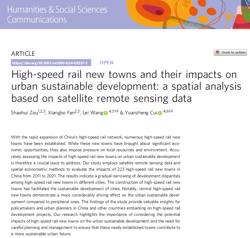 近日,公司2026年国际足联世界杯邹绍辉教授团队的学术论文“High-speed rail new towns and their impacts on urban sustainable development: a spatial analysis based on satellite remote sensing data”在Nature子刊Humanities and Social Sciences Communications(HSSC)上发表。该研究得到国家社会科学基金一般项目(19BGL83)资助。本文是邹教授团队2024年发表的第5篇高水平文章,也是团队成员樊向波博士入学以来发表的第2篇高水平文章。