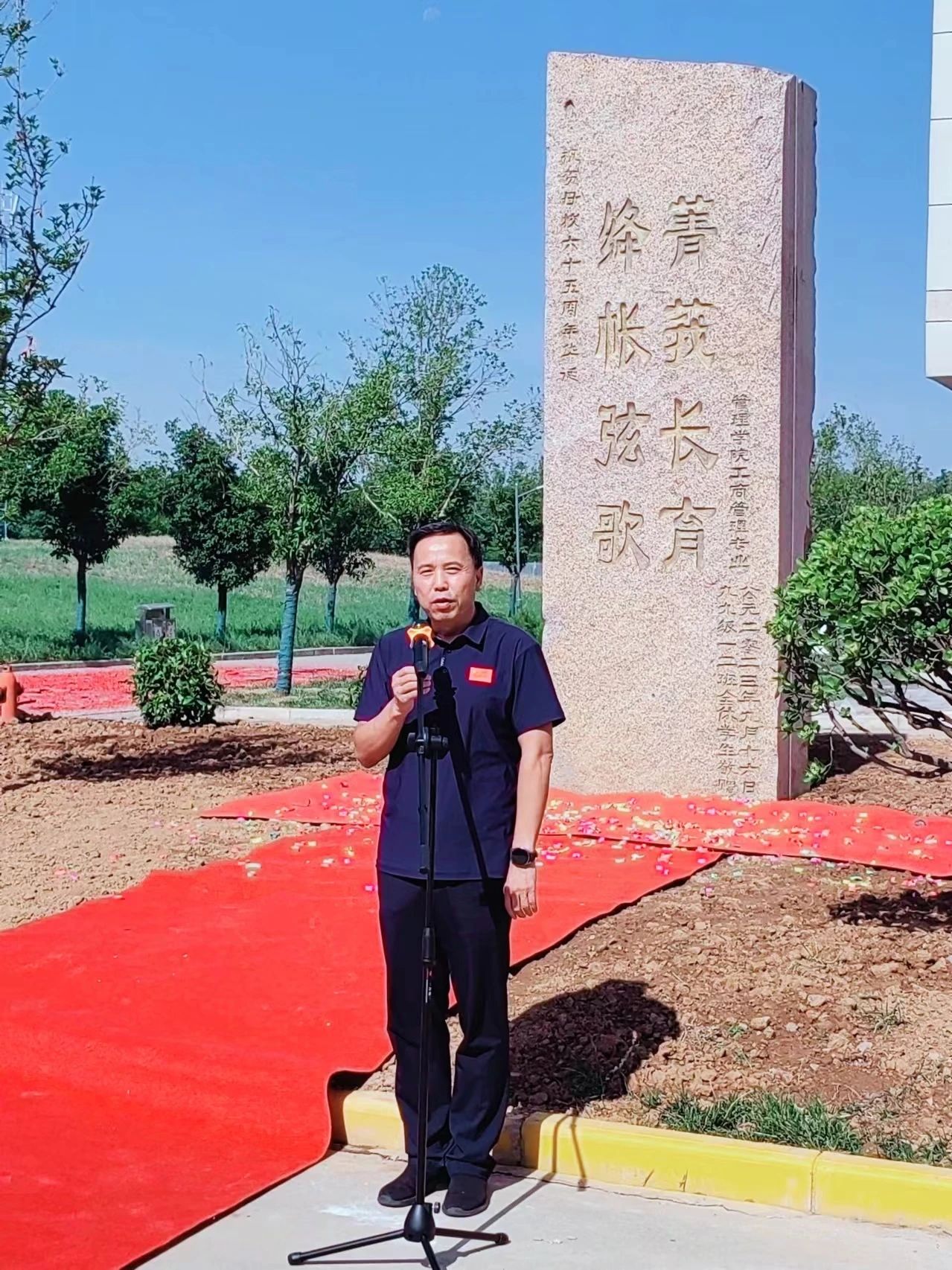 仪式上,工商管理专业99级1-2班员工郭胜介绍了这块来自内蒙古阿拉善、重达十六余吨的景观石的捐赠由来,解读了刻在景观石上的“绛帐弦歌 菁莪长育”的相关典故和深刻内涵。