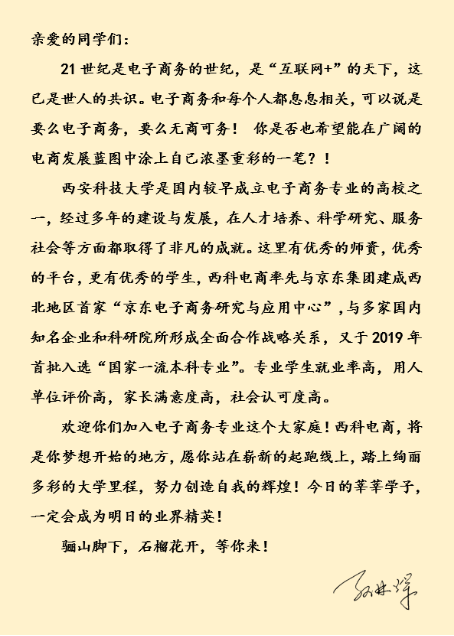 最后,想要告诉你们的是,大学即将成为你未来人生独立自主的一个过渡阶段,希望你能够做好自己的人生定位,选好自己未来想要从事的行业,电子商务如果成为你的选择,那么你一定要跟随你的导师,同时要不断充实自己课外知识储备,这样未来的道路你不仅可以看到不一样的新大陆而且会走得游刃有余。